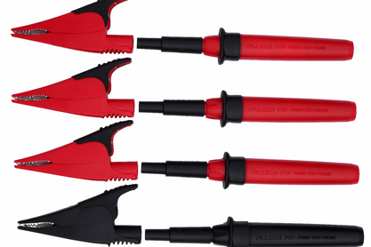 The Fluke FTP17XXPQ test lead set consists of three red probes with alligator clips and one black probe with alligator clip. The tips of the probes have a screw on connector with 4mm plug suitable for attaching the alligator clips, the other end of the probes have 4mm sockets suitable for connecting test leads. The unique design of the probes means that if the fuse has blown a voltage is still displayed by the measurement equipment. This offers an extra level of user security, with some fused probes voltage may not appear to be present if the fuse is blown. The FTP17XX has a high impedance path so a voltage is always displayed. The voltage displayed by measurement equipment will be less than the nominal indicating safely to the user about the presence of a voltage but with a test lead problem.
