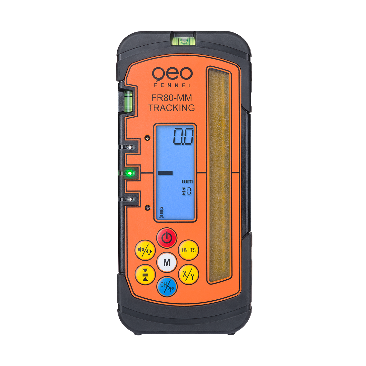 The geo-FENNEL FR 80-MM TRACKING has an extra-long reception field of 120mm, a very robust housing, an easy-to-read display and a sturdy metal bracket for the leveling staff. The FR 80-MM also impresses with its specially developed monitoring function for geo-FENNEL TRACKING rotating lasers, such as the FLG 245HV GREEN, TRACKING, FL275HV TRACKING and the FL 510HV-GTRACKING. Once the tracking process is complete, the tracked axis is continuously monitored by a permanent radio link between the laser and receiver.