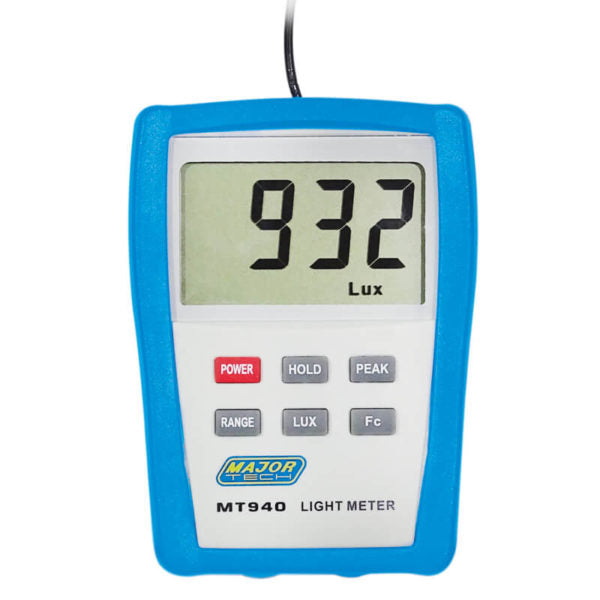 The MT940 is a handheld light meter that provides accurate display of light levels in terms of Foot Candle (FC) or LUX over a wide range. This versatile meter offers Peak Hold and Data Hold functions and can measure light up to 20,000 Lux or FC with an accuracy of 0.01Lux/FC. The light sensor is connected through an extension cable to the meter, providing fast measurements in multiple environments. The readings are displayed on a large and clear LCD display with range annunciations to assist the user. This is an essential tool for Designers or Quality Assurance Managers to troubleshoot or check lighting levels in a variety of situations from office to factory areas where health and safety is a requirement.