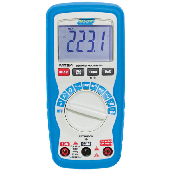 The MT24 is a compact meter with double moulded rubber housing and meets the International Standard IEC-61010-1 CAT lll 600V. The large LCD display screen has a white backlight for use in arduous areas. This meter is a very economical tester ideally suited for everyday use by electricians, electronic technicians as well as the air conditioning industry. The MT24 is an autoranging multimeter with the option of manual override, and has a 6000 count LCD display with a 61 segment analogue bargraph. This meter offers features of MIN/MAX recordings, Data Hold, Frequency measurement with Duty Cycle, Capacitance measurement of up to 4000μF and resistance of 60MΩ. It has the added function of temperature measurement in either °C or °F, with a range from -20°C up to 760°C. An adaptor is supplied which converts the 4mm input to accept K-Type thermocouples.
